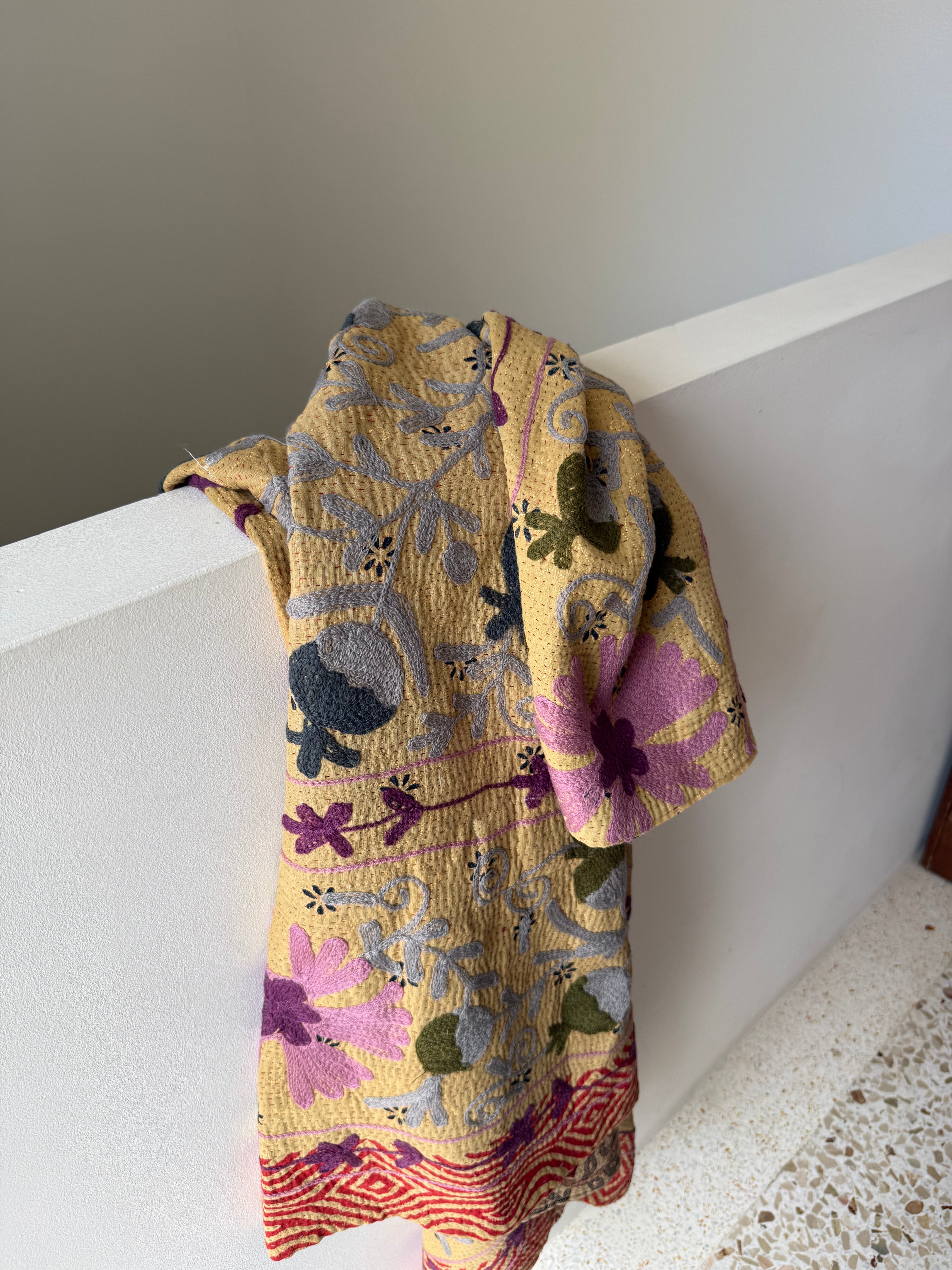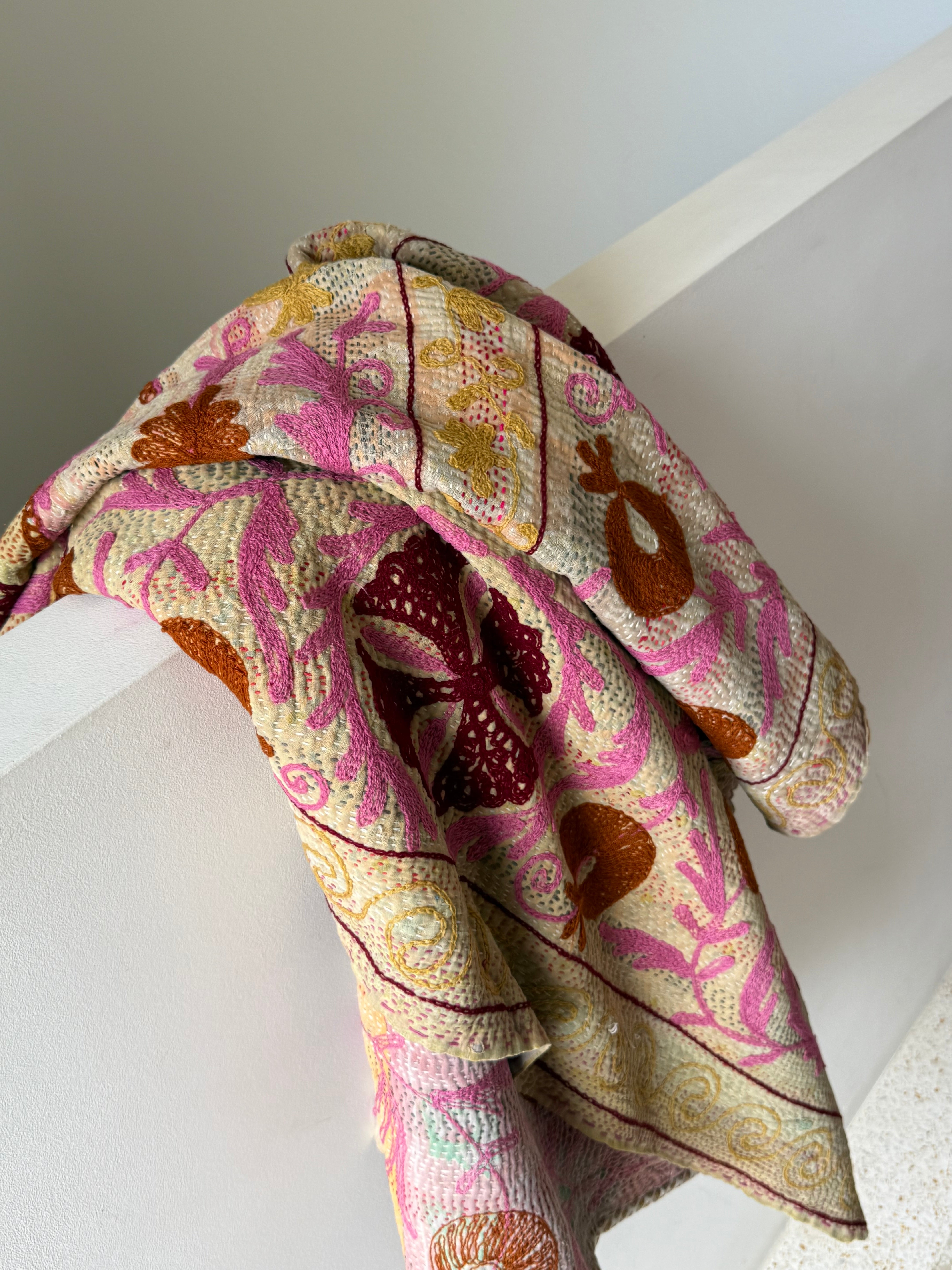The term is derived from the Persian word for needlework, "suzanikari". Suzani tells the enduring story of mothers' love for their daughters and the beautiful handcrafted dowry pieces that they lovingly and laboriously created for their wedding day to bring happiness, protection and prosperity into their married life. This makes them extra special for us as a mother and daughter team here at Kantha Studio