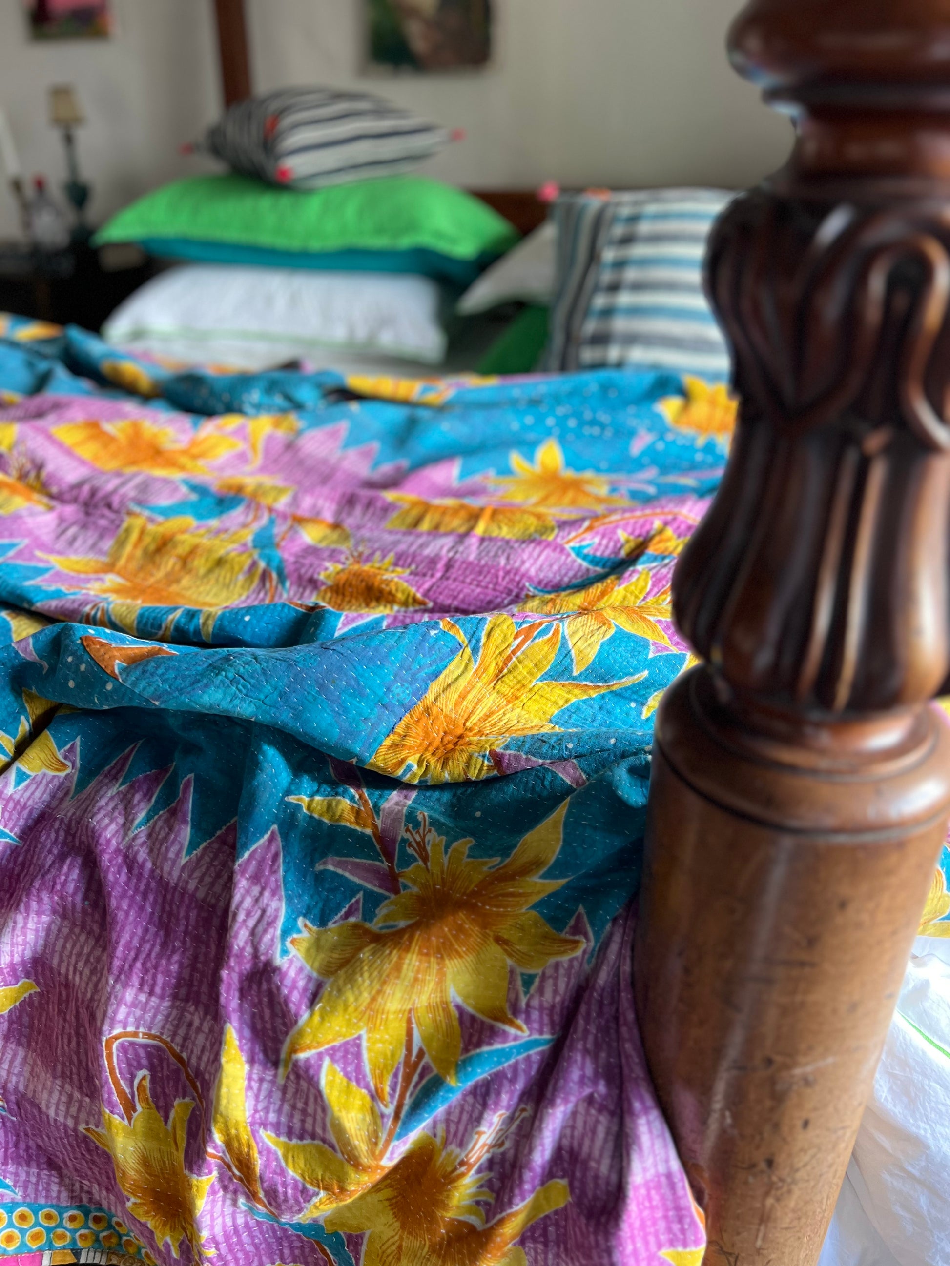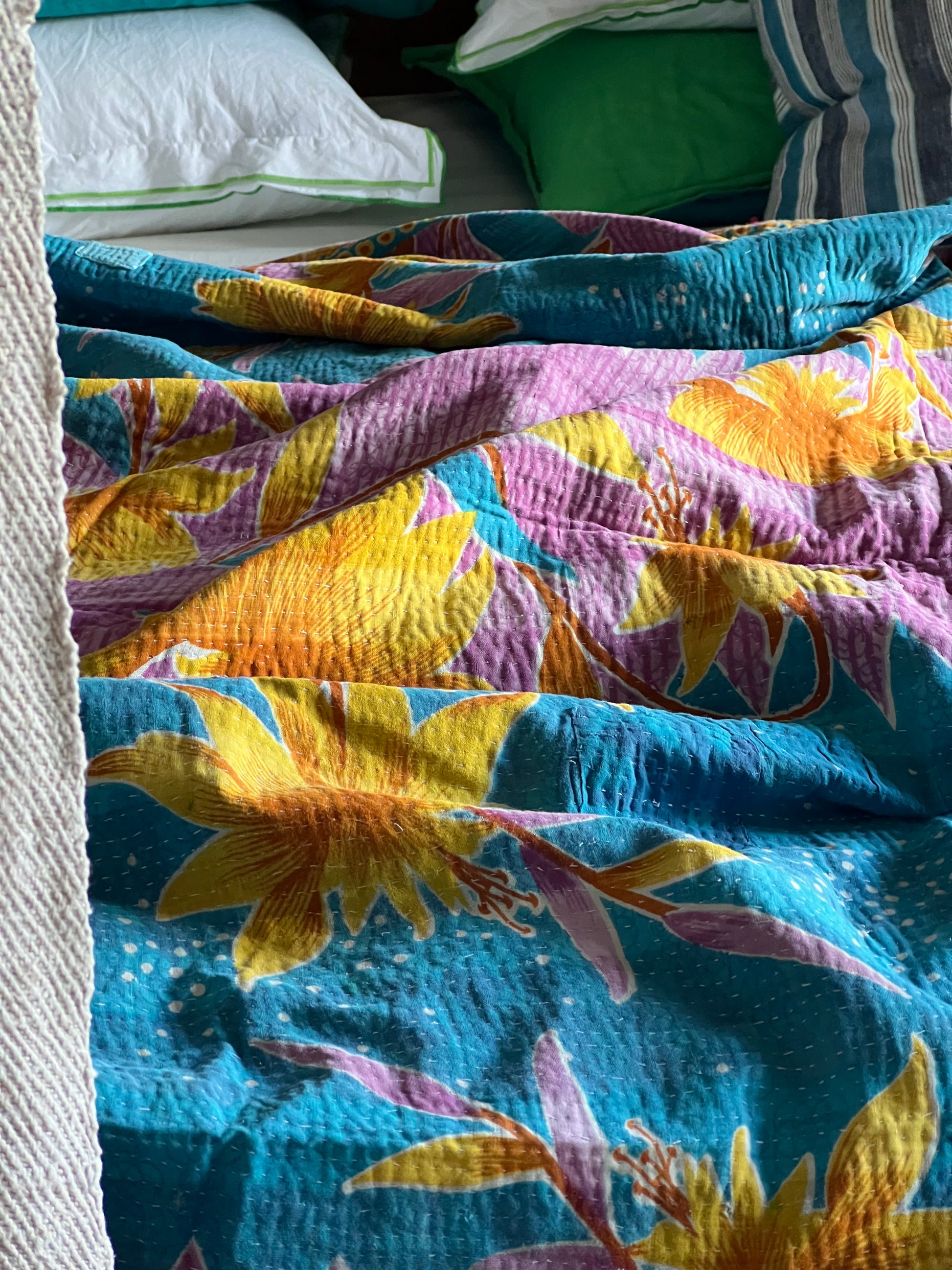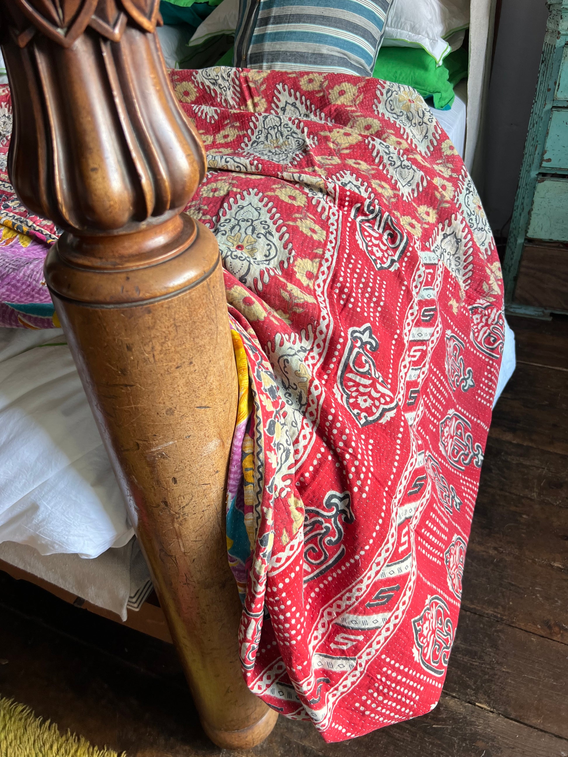 Fun and bright ~ this beauty will lift your spirits on any day ~ perfect on a white bed for a wonderful statement or anywhere in your home ~ a Kantha of two sides ~ the super cool Hawaiian floral on one side reversing to a more tribal red and charcoal cotton kantha ~ soft and vintage with medium weight fine Kantha stitch